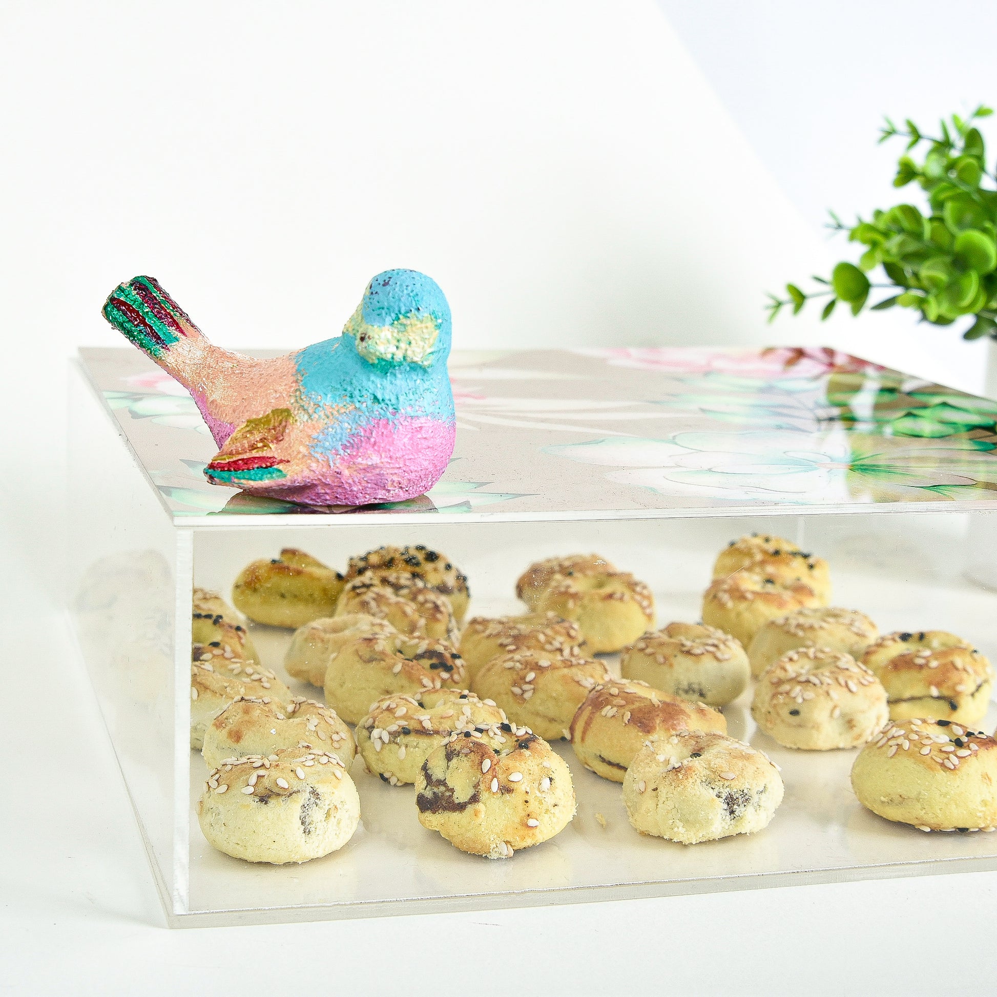 Acrylic square box 25x25 cm with handmade & hand-painted bird ornament and pink floral detail.