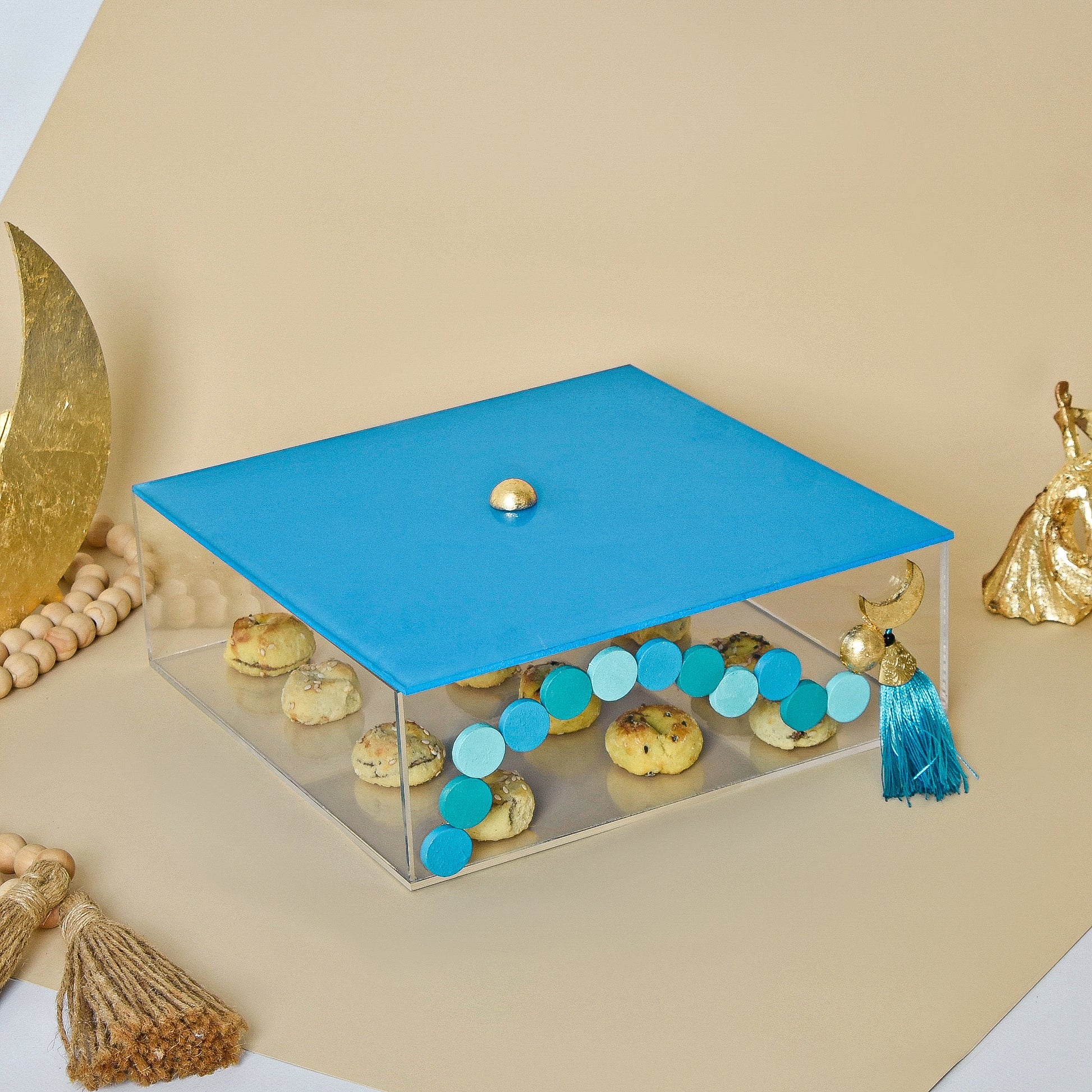 A transparent acrylic square box adorned with a hand-painted beaded crescent motif and enhanced with gold leaf accents. A beautiful choice for presenting cookies, maamoul, or special Ramadan treats.