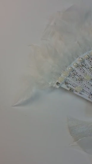 A refined Bridal Fans blending delicate White Feathers with sparkling crystal accents for a radiant effect. The feathers da playful look, perfect for brides seeking both romance and sophistication.