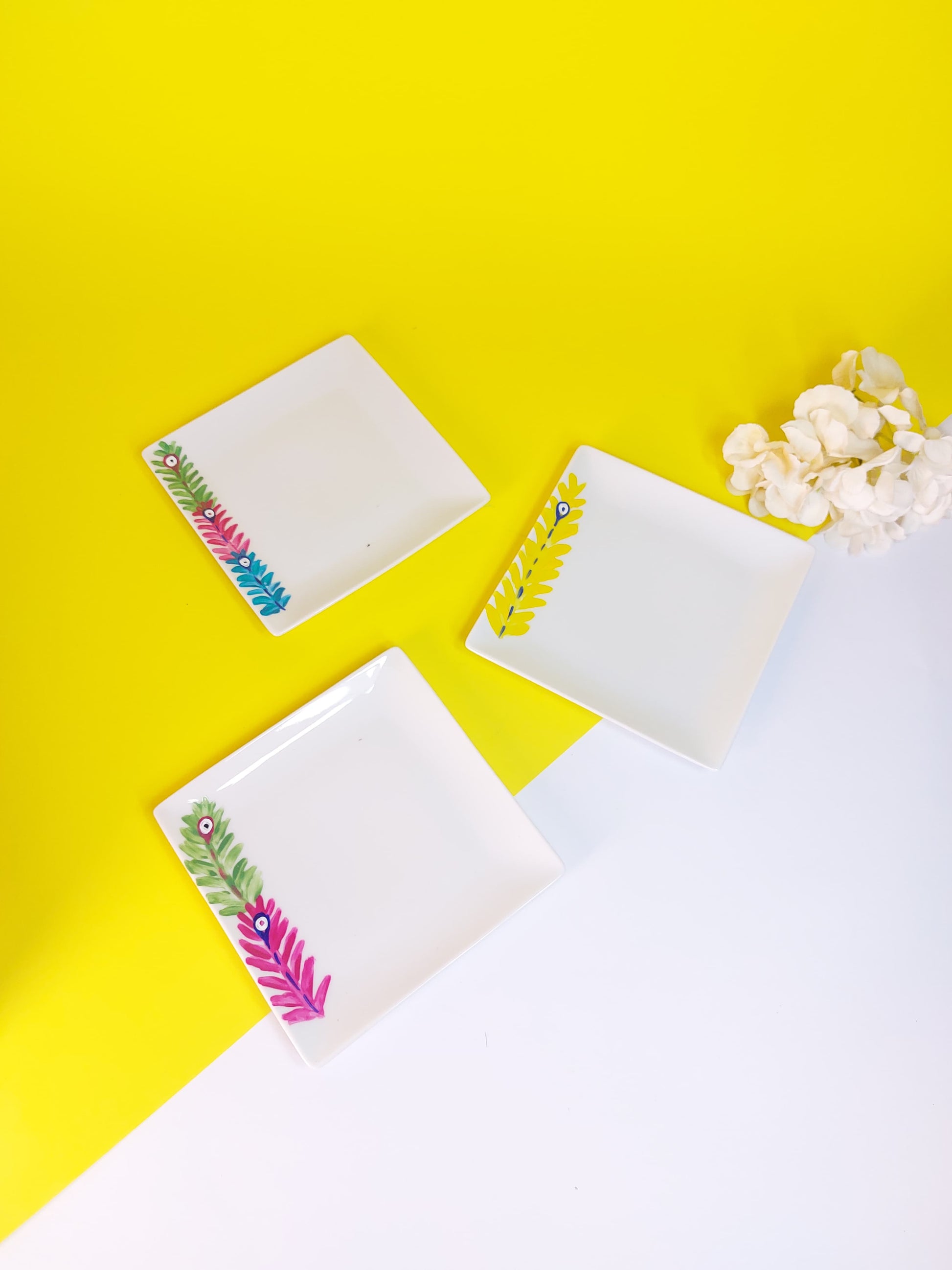 Set of 3 porcelain dessert plates with colorful hand-painted peacock feather motifs.