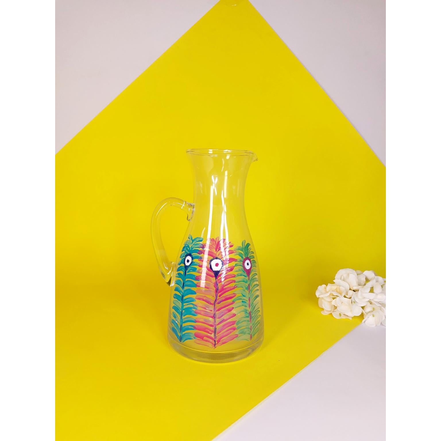 Three Feathers Hand-Painted Glass Pitcher